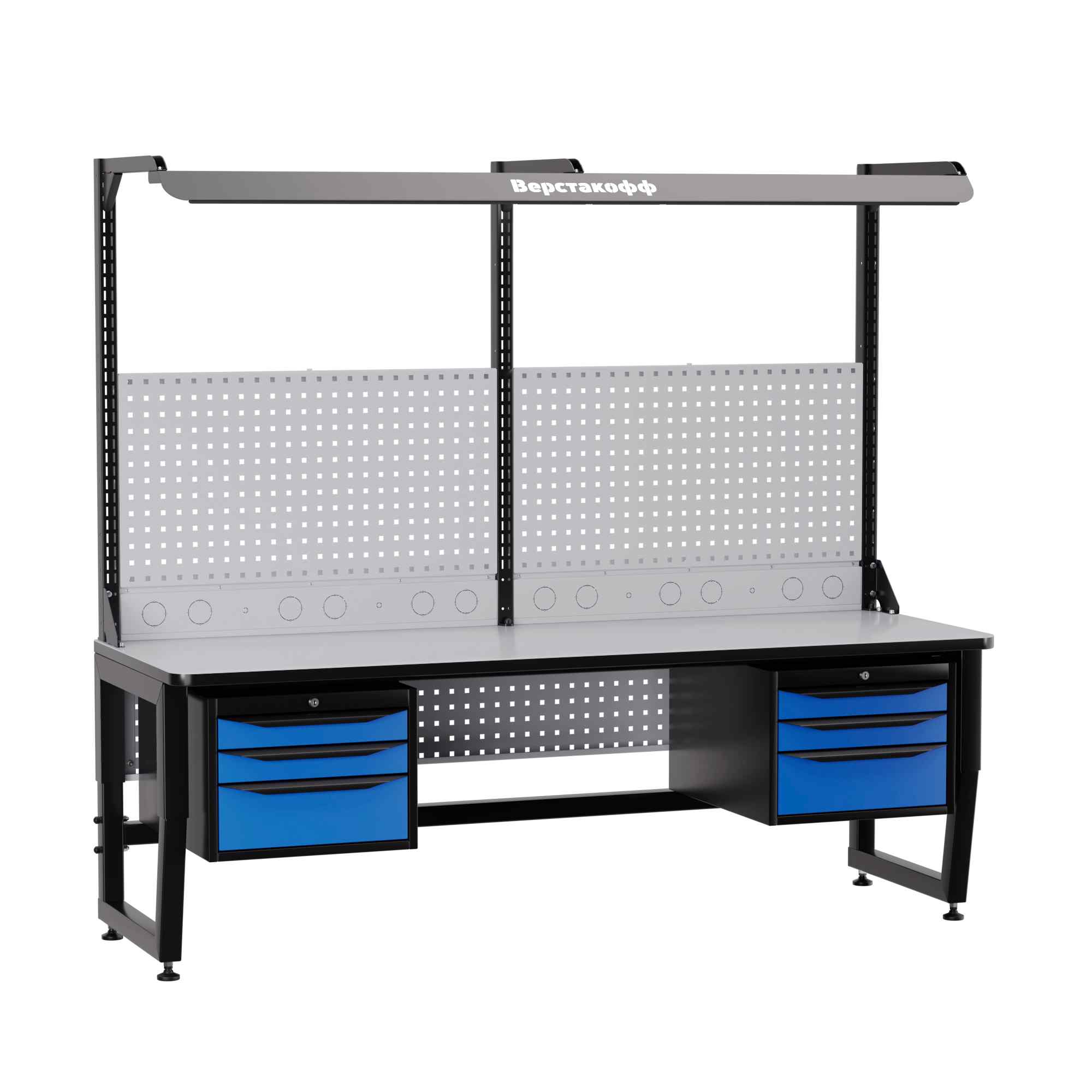 Для наилучшей освещенности при работе с мелкими электронными компонентами рабочее место комплектуется блоком освещения. В его составе - специальный промышленный светильник с необходимой  цветовой температурой и световым потоком, обеспечивающим оптимальные условия работы. Блок освещения располагается над рабочей поверхностью на регулируемых (по высоте и по вылету) кронштейнах<br />