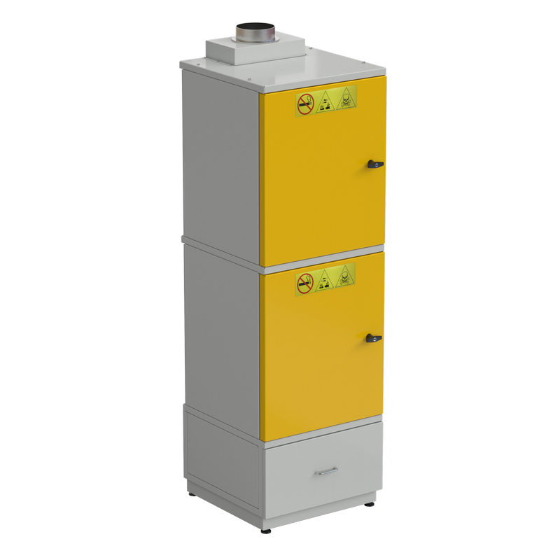 Конструктивно шкаф выполнен в виде трёх секций, соединённых между собой. Две верхние секции, предназначенные для хранения опасных веществ, имеют двойной каркас (внутренние капсулы для хранения, выполненные из стали толщиной 1мм и внешний корпус, выполненный из трубы и листовой стали толщиной 1,5мм) и оснащены распашными дверями, открывающимися на 180°.