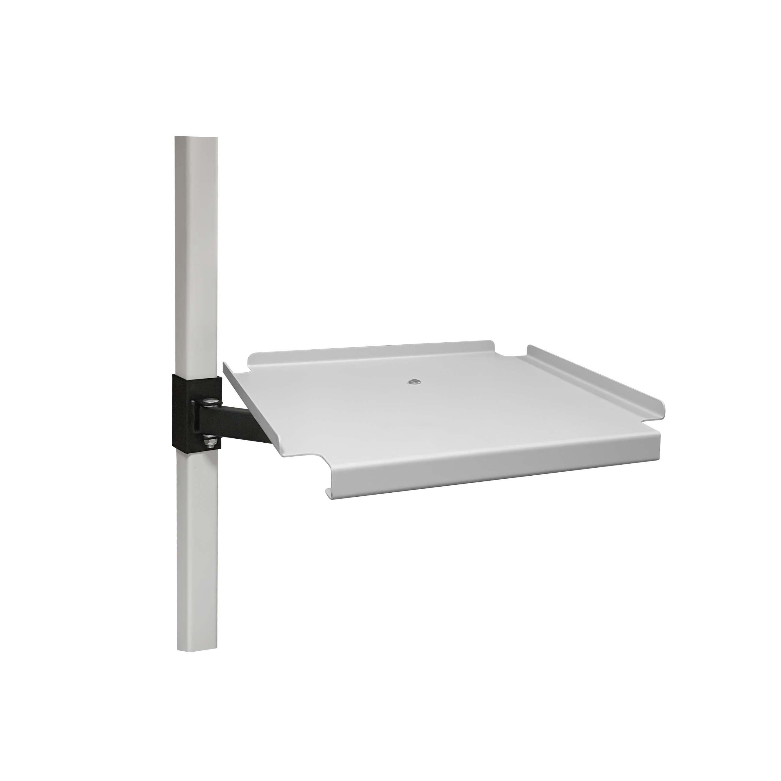 Кронштейн поворотный с подставкой КПС используется для размещения различного рода портативной оргтехники, периферийных устройств и приспособлений. Металлическая площадка имеет габарит 320х320 мм, снабжена удобной ручкой для вращения и пазами для укладки электропроводов устройств. Конструкция кронштейна позволяет расположить подставку на нужном расстоянии от места крепления и под необходимым углом разворота, что создает комфортные условия для использования размещённых на ней устройств. Прочная и долговечная конструкция. Рекомендуемая максимальная нагрузка на кронштейн - до 20 кг.